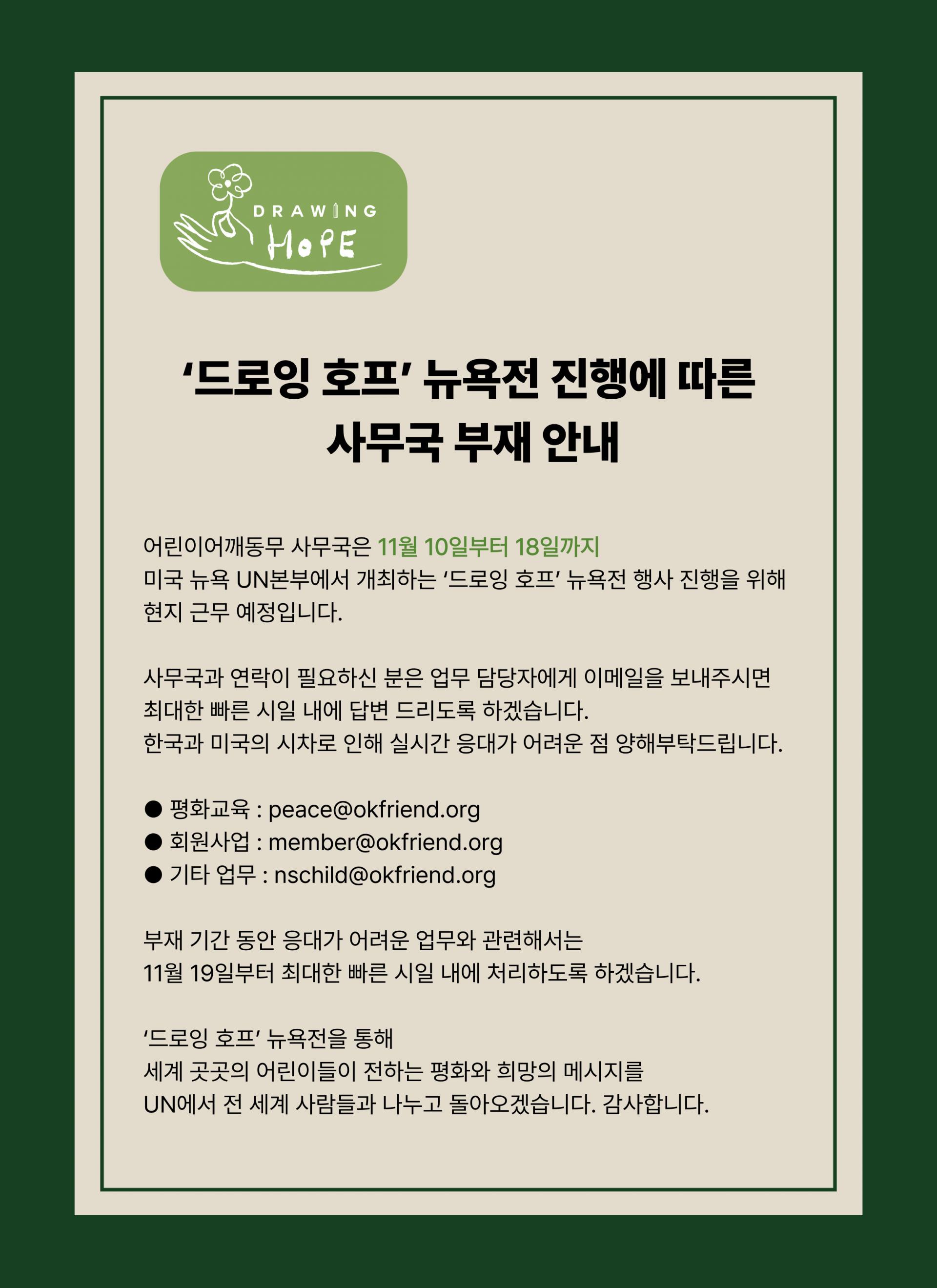 어린이어깨동무 사무국은 11월 10일부터 18일까지 미국 뉴욕 UN본부에서 개최하는 ‘드로잉 호프’ 뉴욕전 행사 진행을 위해 현지 근무 예정입니다. 사무국과 연락이 필요하신 분은 업무 담당자에게 이메일을 보내주시면 최대한 빠른 시일 내에 답변 드리도록 하겠습니다. 한국과 미국의 시차로 인해 실시간 응대가 어려운 점 양해부탁드립니다.