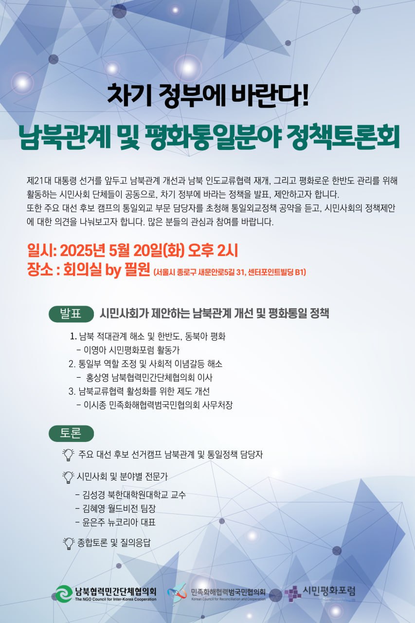 제21대 대통령 선거를 앞두고 차기 정부에 남북관계 및 평화통일 분야 정책을 제안하고, 시민사회의 정책 제안에 대해 주요 대선 후보 캠프 평화통일외교정책 담당자와 의견을 나누는 자리에 여러분들의 관심과 참여를 바랍니다.